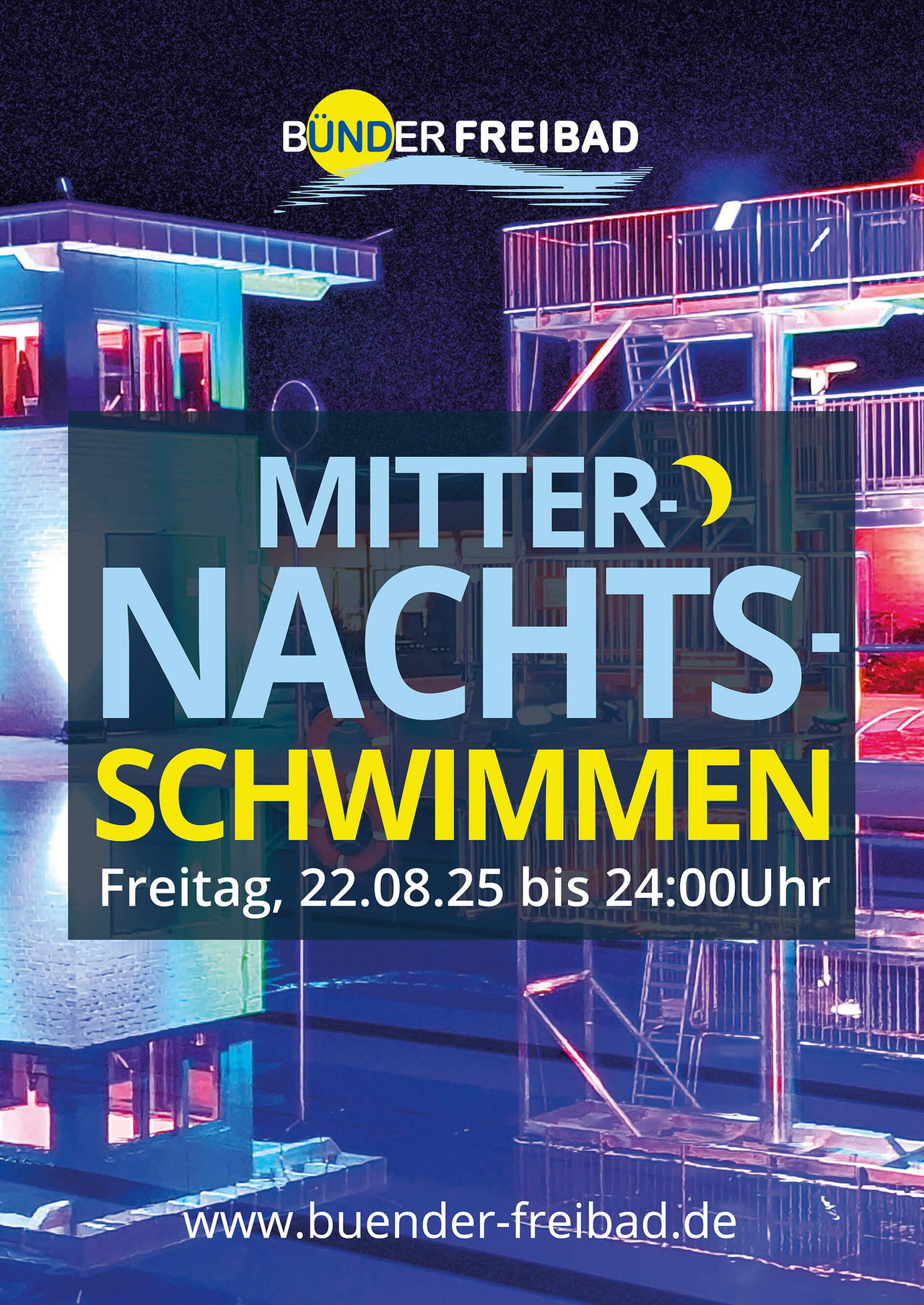 Nach der leuchtenden Premiere im letzten Sommer kehrt das Mitternachtsschwimmen zurück ins Bünder Freibad – und das noch ein bisschen bunter und noch ein bisschen magischer.